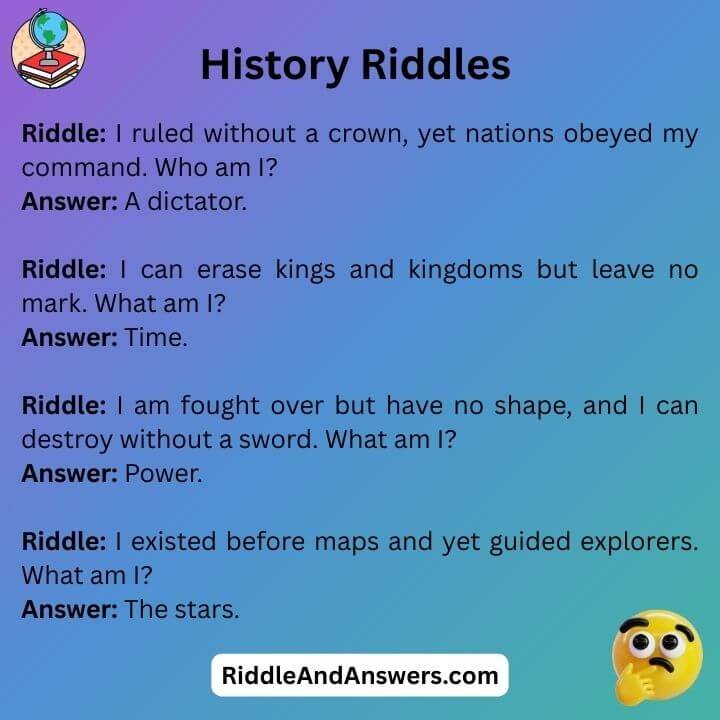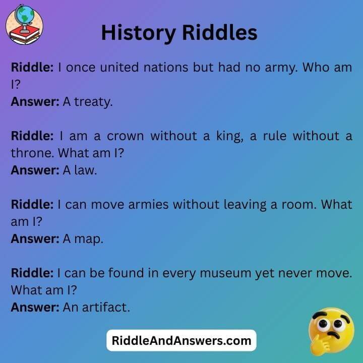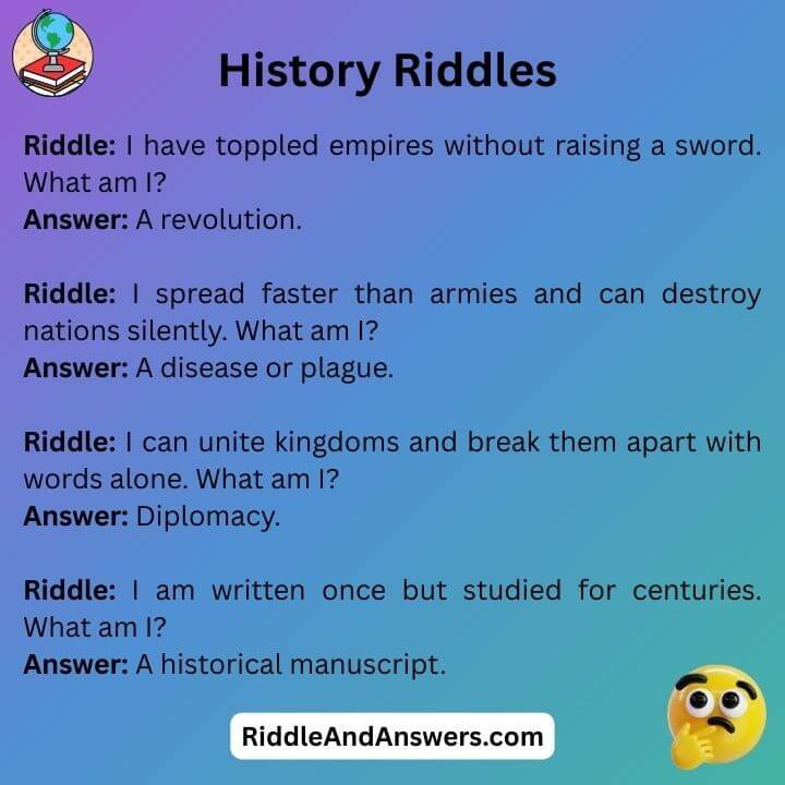 History is full of curious events, strange coincidences, and hidden stories. Some historical facts are so intriguing that they can be turned into riddles that challenge your mind while teaching you something new. For example, can you answer this one: What month brings heat but melts nothing? Dive into these History Riddles and see if you can crack the puzzle while learning fascinating tidbits from the past.