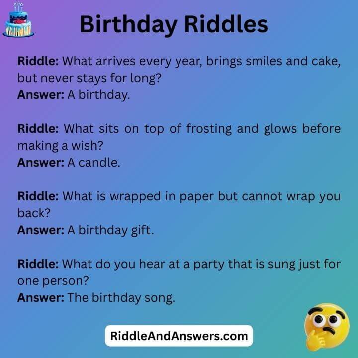 Birthdays are fun and full of surprises. Birthday Riddles make you think and laugh at the same time. For example, one riddle asks, “What month brings heat but melts nothing?” These riddles are great for games, cards, or just sharing a smile with friends and family.
